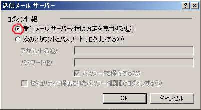 5.デフォルトで「受信メールサーバーと同じ設定を使用する」にチェックされている事を確認し、「OK」をクリックして下さい。